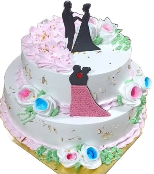 The design is centered around romantic black silhouettes: a charming couple topper on the upper tier and a second silhouette on the lower tier adorned with a pink textured gown. Perfect for engagement ceremonies, ring ceremonies, or wedding anniversaries, this cake blends classic floral elegance with a modern thematic touch.